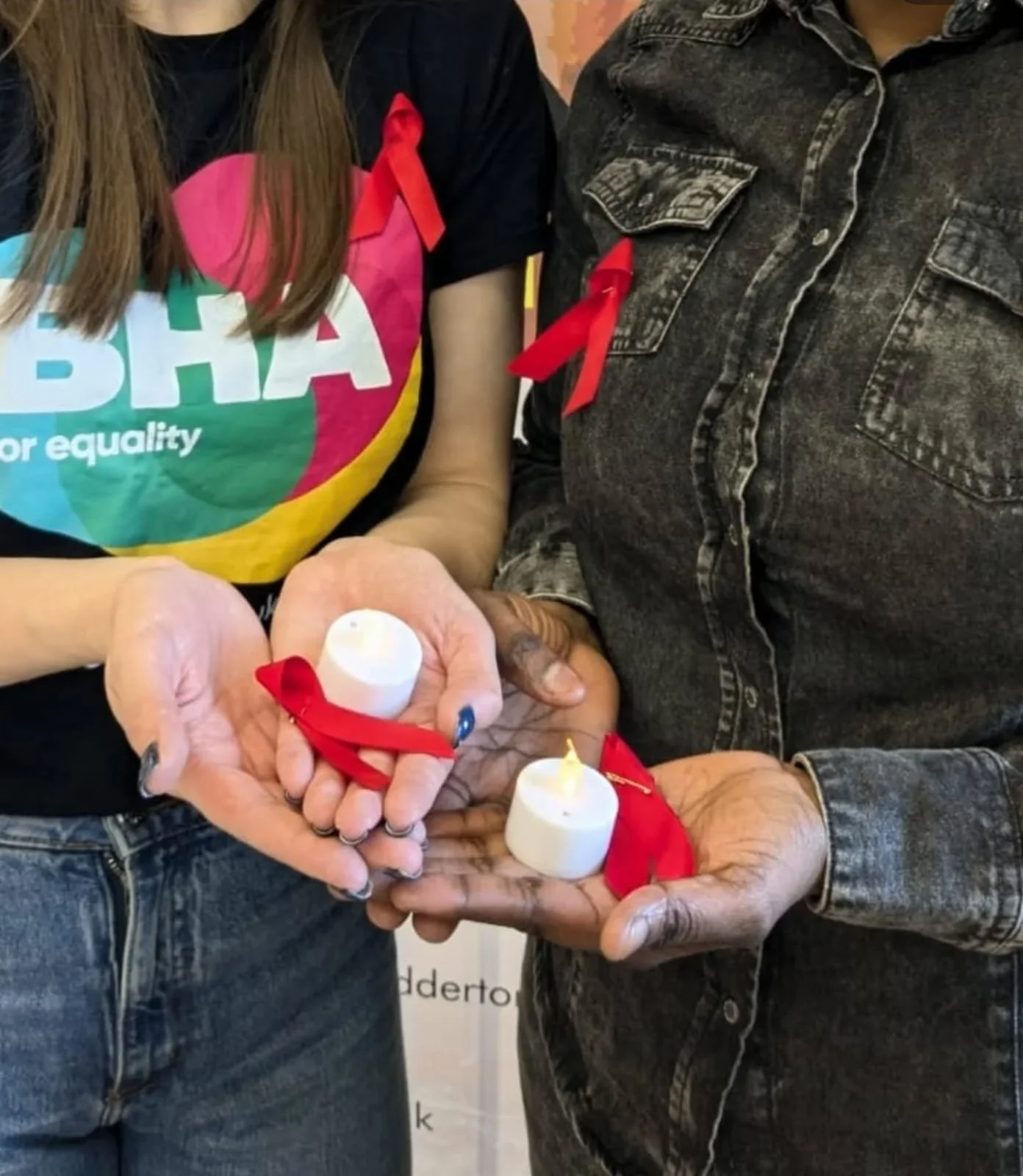 Two people holding small candles with red ribbons attached, symbolizing a memorial or awareness event.